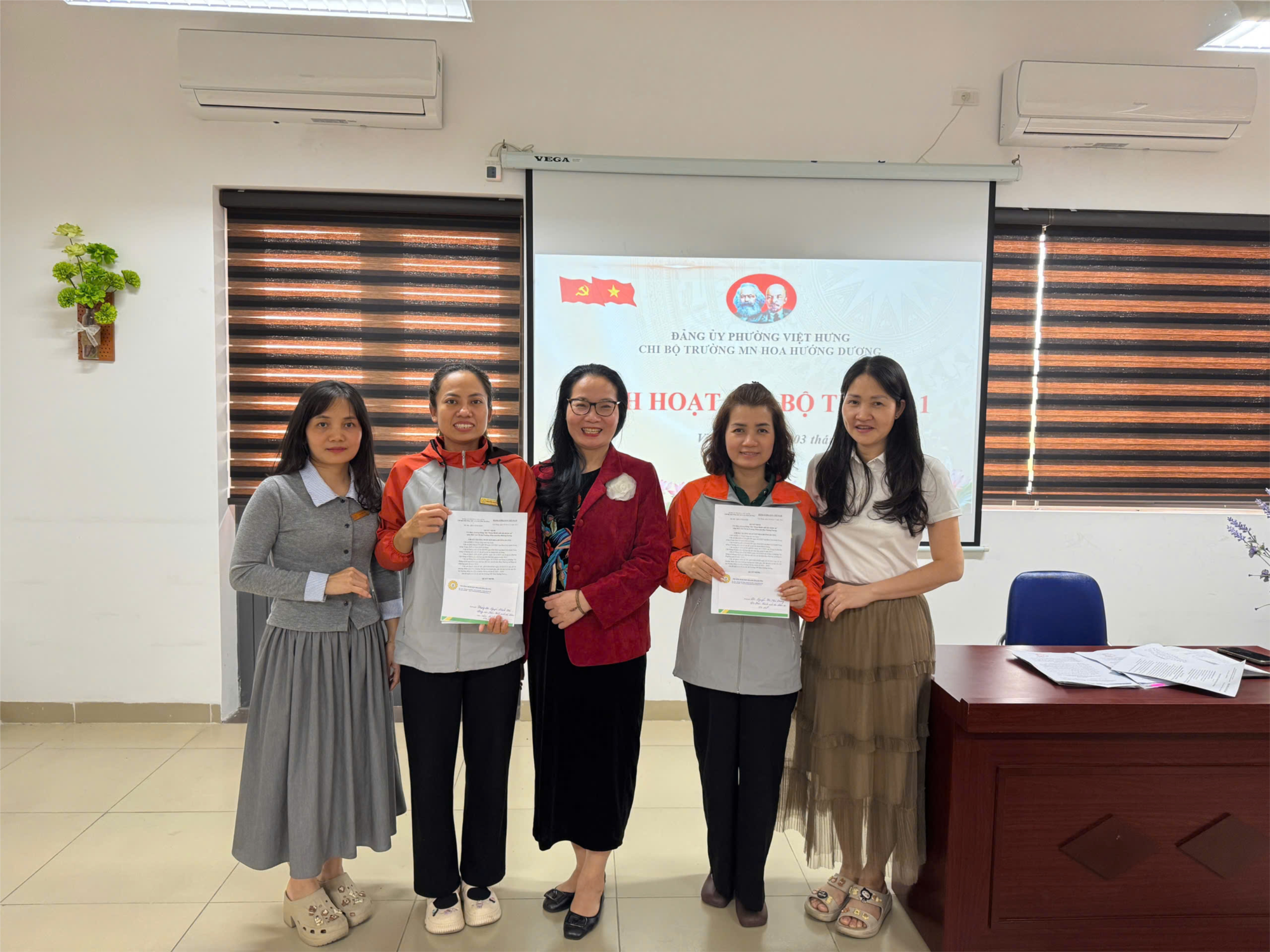 Cũng trong khuôn khổ buổi sinh hoạt, Chi bộ Trường Mầm non Hoa Hướng Dương đã long trọng trao Giấy khen đảng viên hoàn thành xuất sắc nhiệm vụ năm 2025 cho 02 đồng chí đảng viên có nhiều nỗ lực, đóng góp tích cực trong công tác chuyên môn và xây dựng tổ chức Đảng: Đc Nguyễn Khánh Hoà và Đc Nguyễn Thị Mai Hương. Đây là sự ghi nhận xứng đáng, đồng thời là nguồn động viên, khích lệ để các đồng chí tiếp tục phát huy tinh thần trách nhiệm, hoàn thành tốt nhiệm vụ trong những năm tiếp theo.