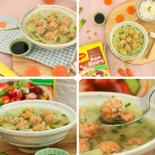 Bắt nồi nước sôi rồi cho 10gr tôm khô, nấu 5 phút để tôm khô mềm ngọt canh, tiếp điến cho thịt viên vào. Nấu sôi sau đó cho bắp cải và nêm thêm 1 muỗng canh hạt nêm Maggi Nấm hương, nấu chín 10 phút, rắc hành lá cho thơm rồi tắt bếp.