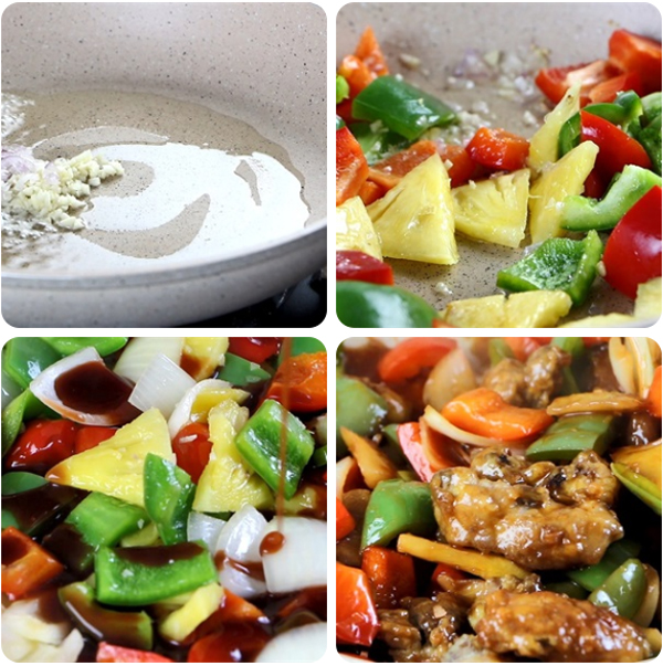 Bước 4: Cách làm sườn xào chua ngọt: Phi 1 muỗng canh tỏi băm, 1 muỗng canh hành tím băm cho vàng rồi thêm 150gr ớt chuông xanh, 150gr ớt chuông đỏ, 80gr thơm và 80gr hành tây và nước sốt chua ngọt vào đảo đều tay. Cuối cùng là cho sườn chiên vào xào, đảo đều rồi tắt bếp.