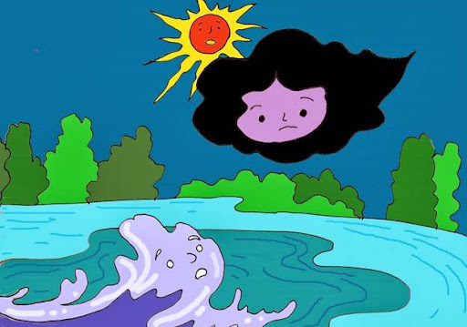 Những ngày hè trời nắng chang chang. Hồ nước bị nung nóng bốc hơi dần lên nên ngày càng bé lại. Chị Mây vẫn giận hồ nước nên ở tít trên cao. Hồ nước bị cạn kiệt dần. Nó cầu cứu: “Chị Mây ơi! Không có chị tưới nước xuống tôi chết mất”. Bầy cá tôm trong hồ cũng than vãn: “Chúng tôi chết mất vì thiếu nước…”