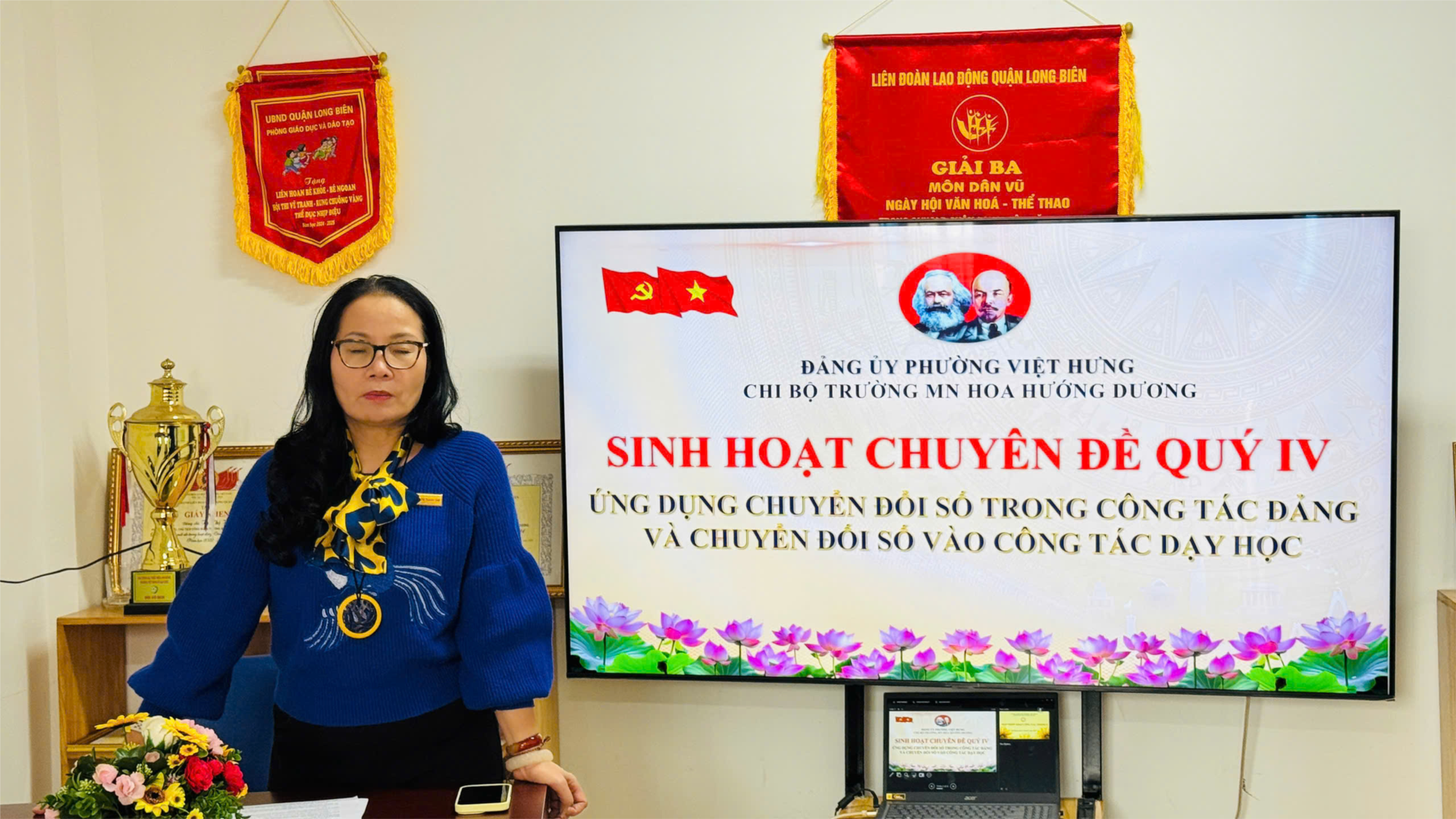 Thực hiện Kế hoạch sinh hoạt chuyên đề năm 2025, sáng ngày 03 tháng 11 năm 2025, Chi bộ Trường Mầm non Hoa Hướng Dương đã tổ chức sinh hoạt chuyên đề quý IV với chủ đề “Ứng dụng chuyển đổi số trong công tác Đảng và chuyển đổi số vào công tác dạy học”.