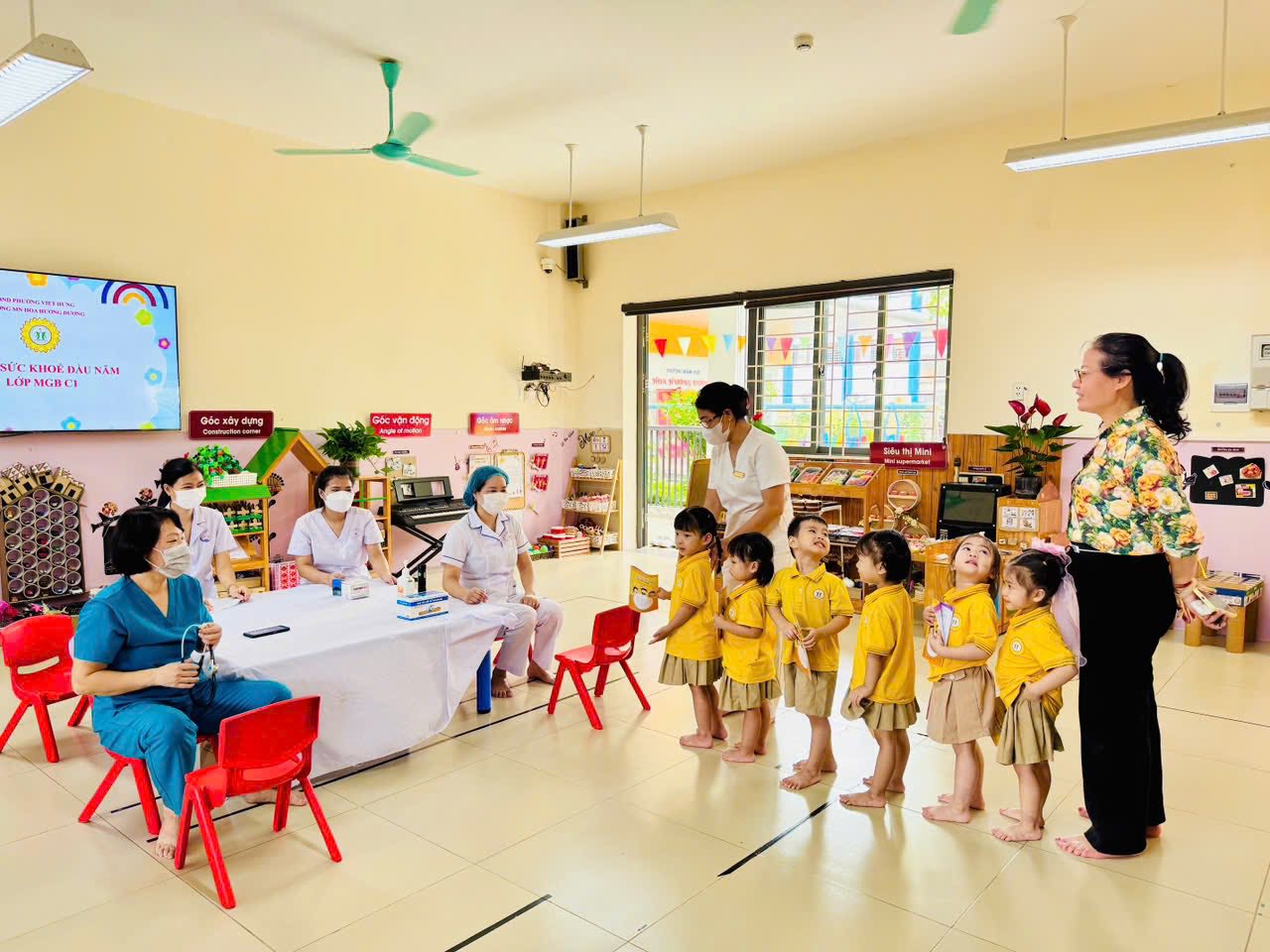 Trong buổi khám, đội ngũ y bác sĩ đã tận tình kiểm tra các chỉ số như: chiều cao, cân nặng, mắt, tai – mũi – họng, răng miệng, tim mạch, da liễu… Qua đó, nhà trường và phụ huynh nắm bắt được tình trạng sức khỏe, từ đó có kế hoạch chăm sóc, nuôi dưỡng trẻ phù hợp.