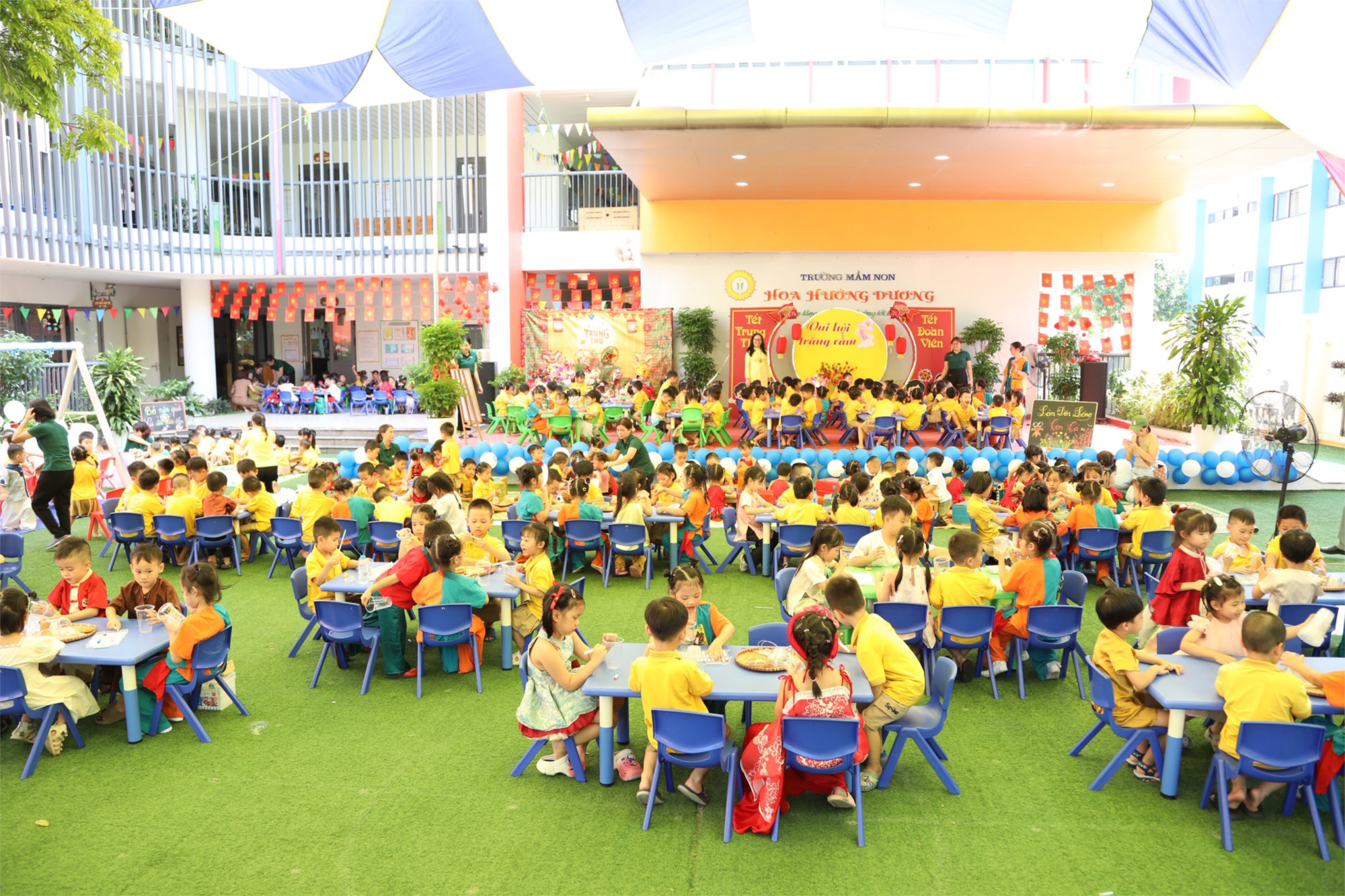 Điểm nhấn của chương trình chính là khu trải nghiệm sáng tạo: bịt mắt đánh trống, bóng bay ánh trăng, nặn quả mùa thu, trang trí đầu lân, làm bánh trung thu, ghép trăng khổng lồ, tô màu mặt nạ chú Tễu, làm đèn lồng cá, làm con kỳ lân… Những hoạt động này không chỉ giúp các bé hiểu hơn về nét đẹp văn hoá truyền thống, mà còn rèn luyện sự khéo léo, phát huy trí tưởng tượng và tinh thần gắn kết bạn bè.