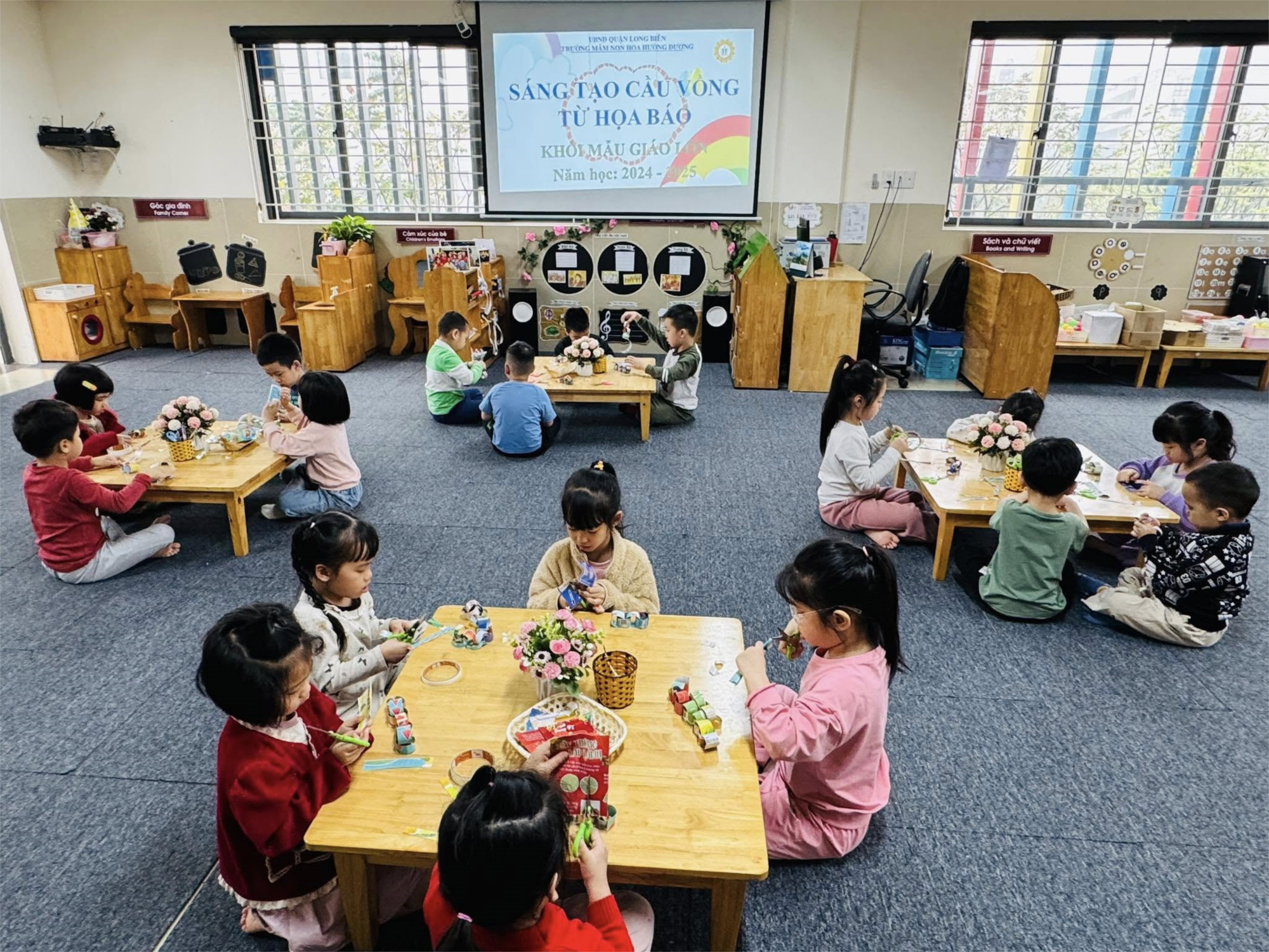 Sáng nay, các bạn nhỏ khối Mẫu giáo lớn đã có một hoạt động thủ công đầy thú vị mang tên “Sáng tạo cầu vồng từ họa báo”. Với những nguyên vật liệu đơn giản như: họa báo nhiều màu sắc, kéo, băng dính hai mặt, giấy nền… các bé đã cùng nhau tạo nên những chiếc cầu vồng rực rỡ và độc đáo theo trí tưởng tượng của mình.