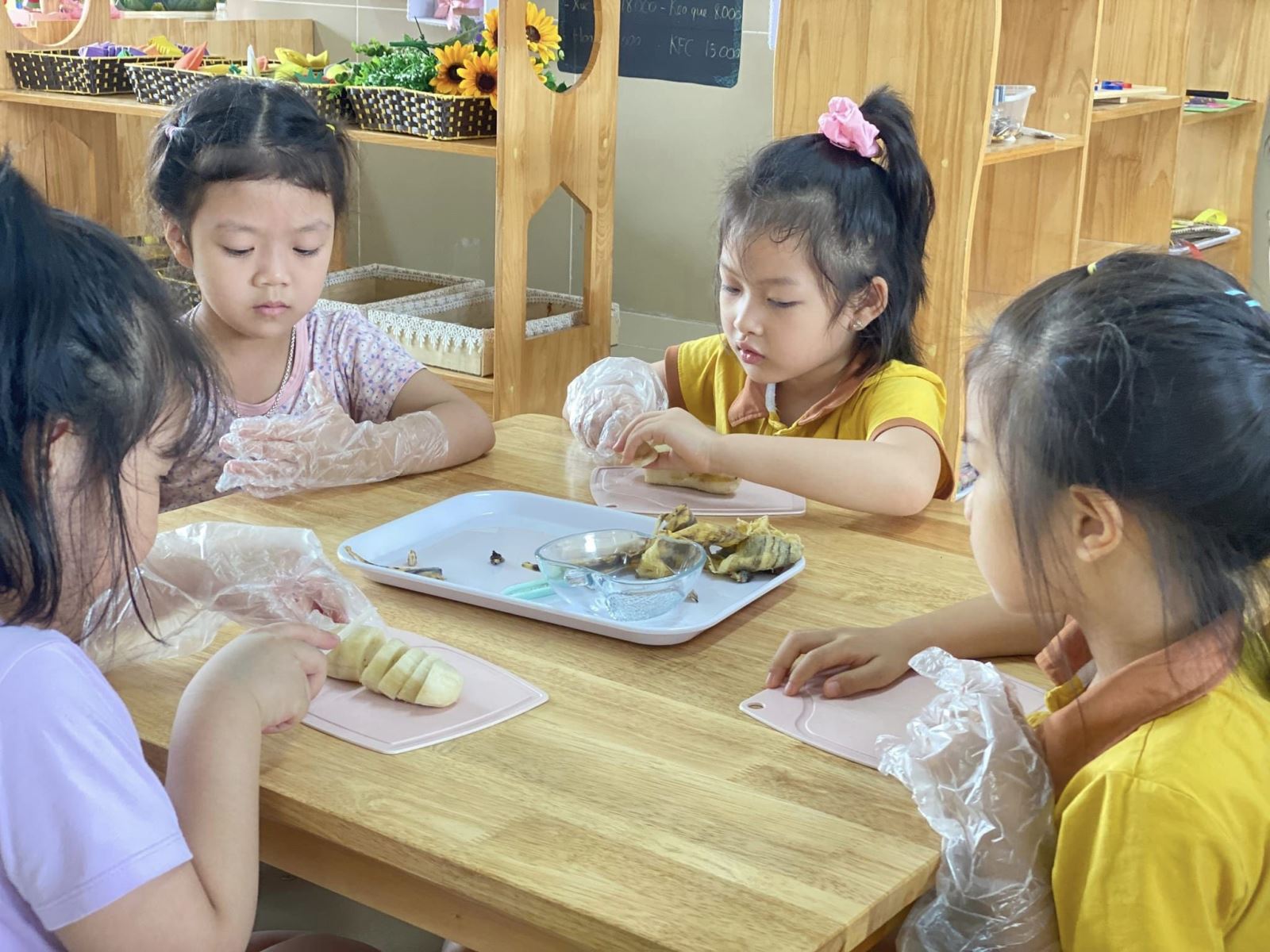 Mời ba mẹ và các bạn cùng xem các bạn nhỏ trổ tài làm kem chuối dừa như thế nào nhé!