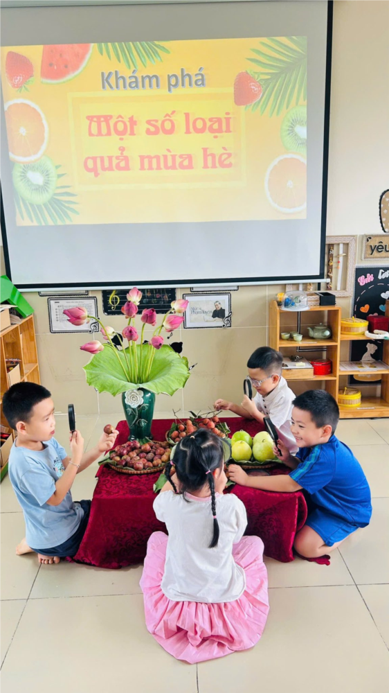 Không chỉ được quan sát, sờ, ngửi, mà các bé còn được thưởng thức hương vị thơm ngon của từng loại quả, rèn luyện các giác quan và phát triển khả năng nhận biết một cách tự nhiên.