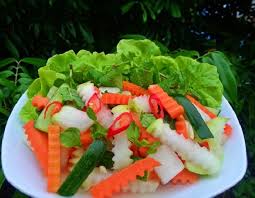 Dưa chuột bổ đôi, bỏ ruột, su hào cà rốt rửa sạch sau đó dùng dao có hình răng cưa cắt tất cả thành hình sao cho đẹp mắt, trộn với 2 thìa cà phê muối tinh, ướp trong 15 phút, đổ bỏ phần nước tiết ra để rau củ được giòn hơn.