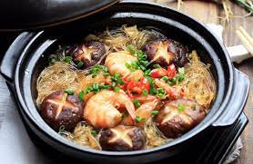 Đun nóng nồi đất, trải một lớp miến xuống đáy nồi, sau đó xếp nấm và tôm lên trên. Thêm xíu muối, sau đó cho nước tương nhạt, rượu nấu, tiêu và nước. Gia vị sẽ được ngấm dần trong suốt quá trình làm nóng sau đó.