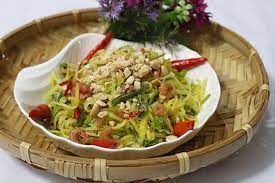Xoài xanh 3 quả có vị chua hoặc chua vừa. Tôm khô: 40gr. Rau thơm: rau răm,mùi ta. Lạc rang vàng.