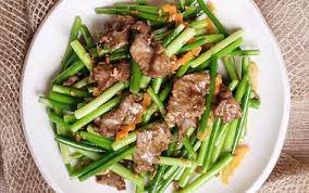 Bước 6: Cuối cùng cho thịt bò vào xào cùng ngồng tỏi. Nêm mì chính rồi cho thịt bò xào ngồng tỏi xào ra đĩa.