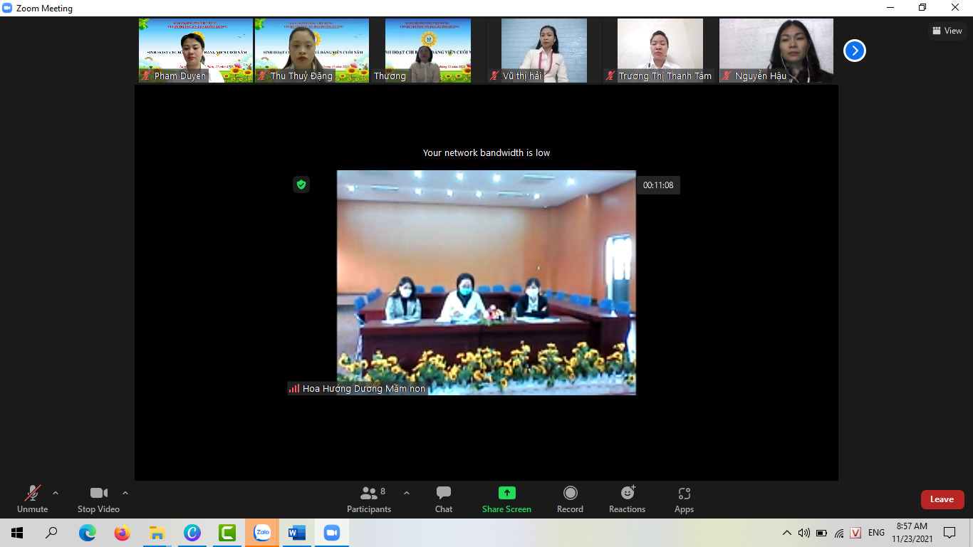 Được  !important;sự đồng ý của Ban thường vụ Đảng ủy Phường Việt Hưng, Chi bộ trường Mầm Non Hoa Hướng Dương tiến hành sinh hoạt chi bộ, kiểm điểm, đánh giá, xếp loại đảng viên năm 2021 qua phòng họp trực tuyến Zoom meeting. Tổng số đảng viên của chi bộ đến thời điểm đánh giá là 11 đồng chí, trong đó chính thức 10, dự bị 01 đồng chí. Tổng số đảng viên dự họp 11/11, đạt tỷ lệ 100%. Chủ trì buổi họp là đồng chí Đỗ Thị Thanh Tâm – BTCB- Hiệu trưởng nhà trường.