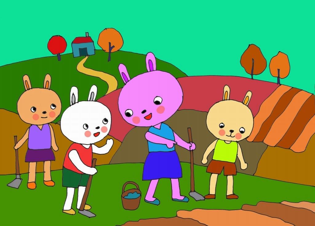 Mẹ giảng xong, ba anh em bắt đầu làm việc, mỗi người phải trồng một luống rau nho nhỏ. Hai anh của thỏ Út cặm cụi cuốc đất, đập đất cho nhỏ tơi ra rồi mới gieo hạt, còn Thỏ Út thì chỉ làm qua quýt rồi nhảy đi chơi.