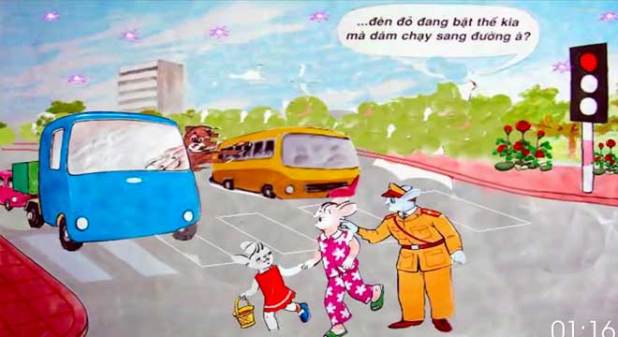 – Các cháu có nhìn thấy tín hiệu đèn đỏ kia không? Khi nào đèn đỏ tắt, đèn xanh bật lên các cháu mới được qua đường. Lần sau, hai cháu phải chú ý nhé!